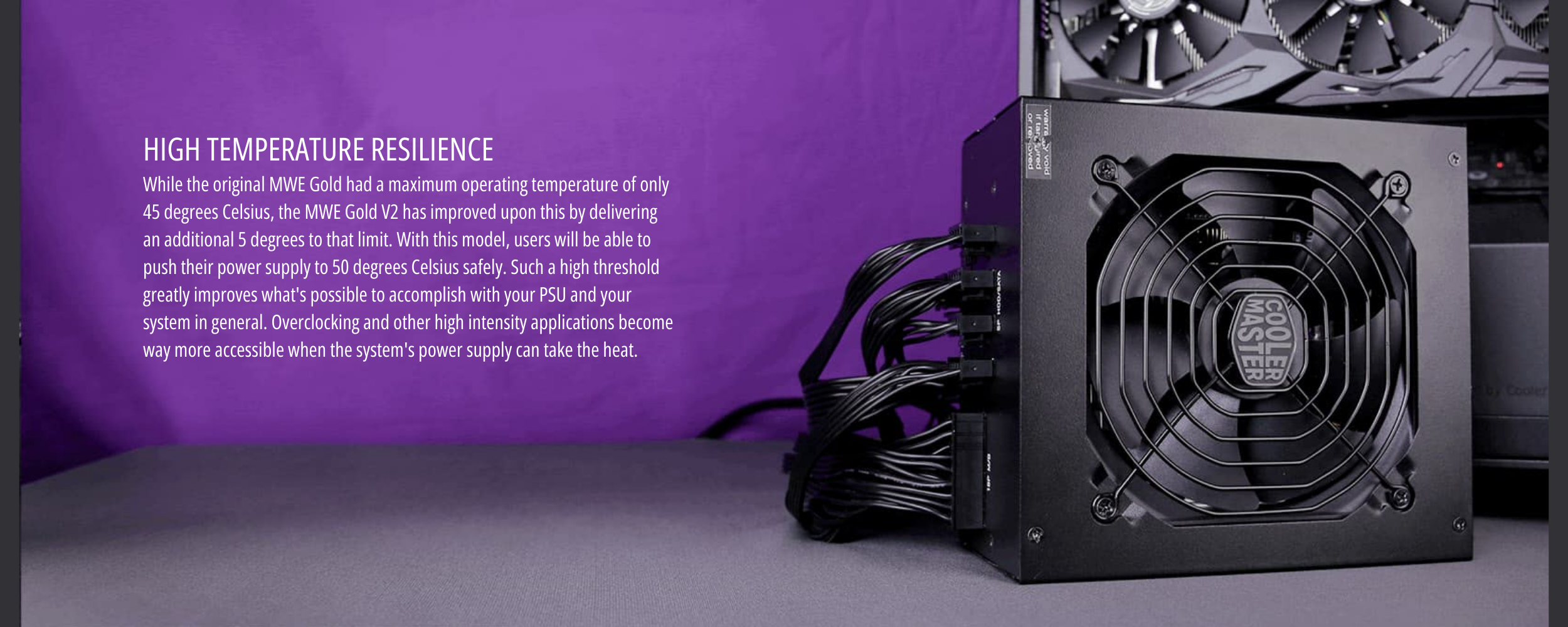 The MWE Gold V2 has been upgraded with a Hydraulic Dynamic Bearing (HDB) fan to deliver quiet and effective cooling with a long lifespan, allowing users to get the most out of their PSU. Furthermore, a number of measures have been applied to the MWE Gold V2 design to reduce sound output and ripple noise for a quieter user experience.High Temperature Resilience