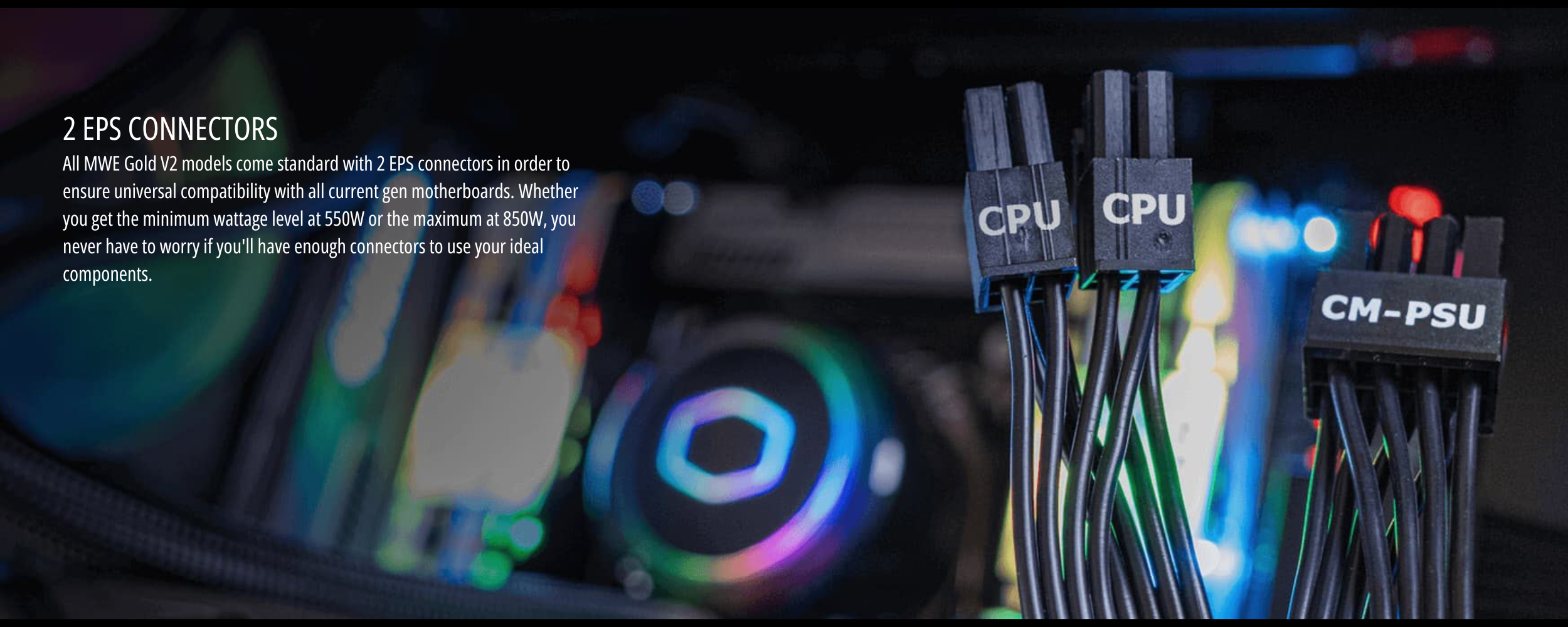 Efficiency has always been one of the most important factors for users when choosing their power supply unit. The MWE Gold V2 delivers an 80 PLUS Gold certification, guaranteeing a typical minimum efficiency of 90%.Two EPS Connectors