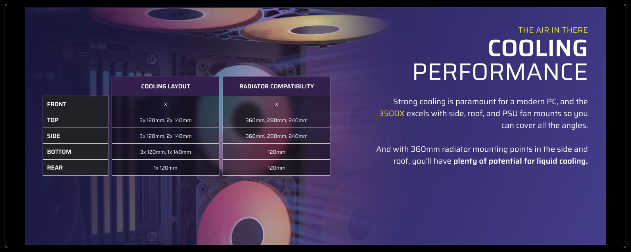 Show off your components and RGB lighting thanks to the tempered glass front and side panels with dedicated front ventilation channels for ample airflow to your system components.Extreme Cooling Potential