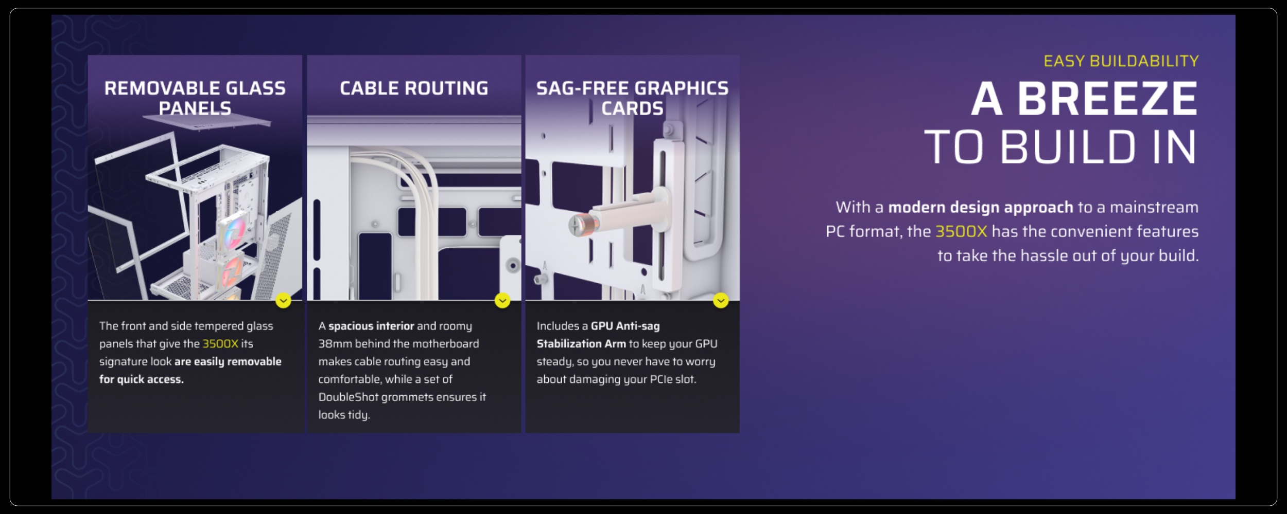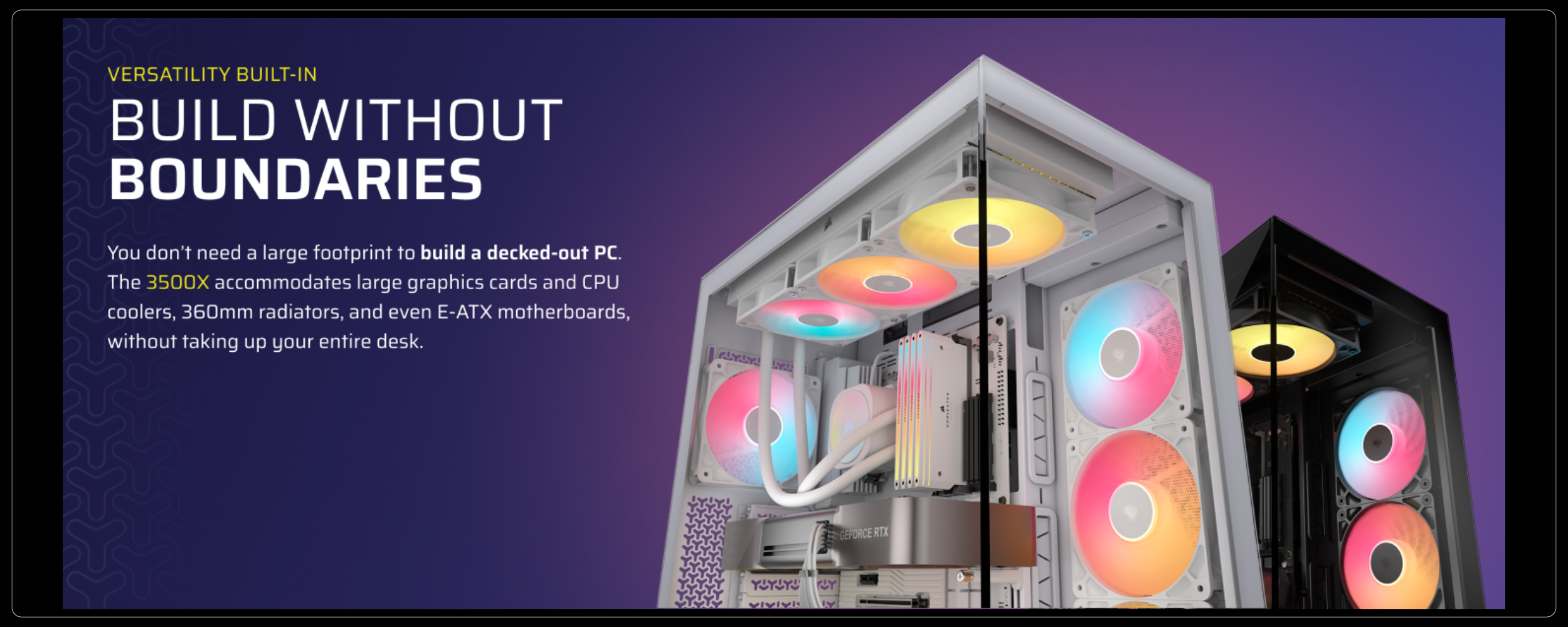 The 3500X ARGB fits up to two 2.5" SSDs and two 3.5" HDDs simultaneously with the removable drive plate.Vertical GPU Mount Ready