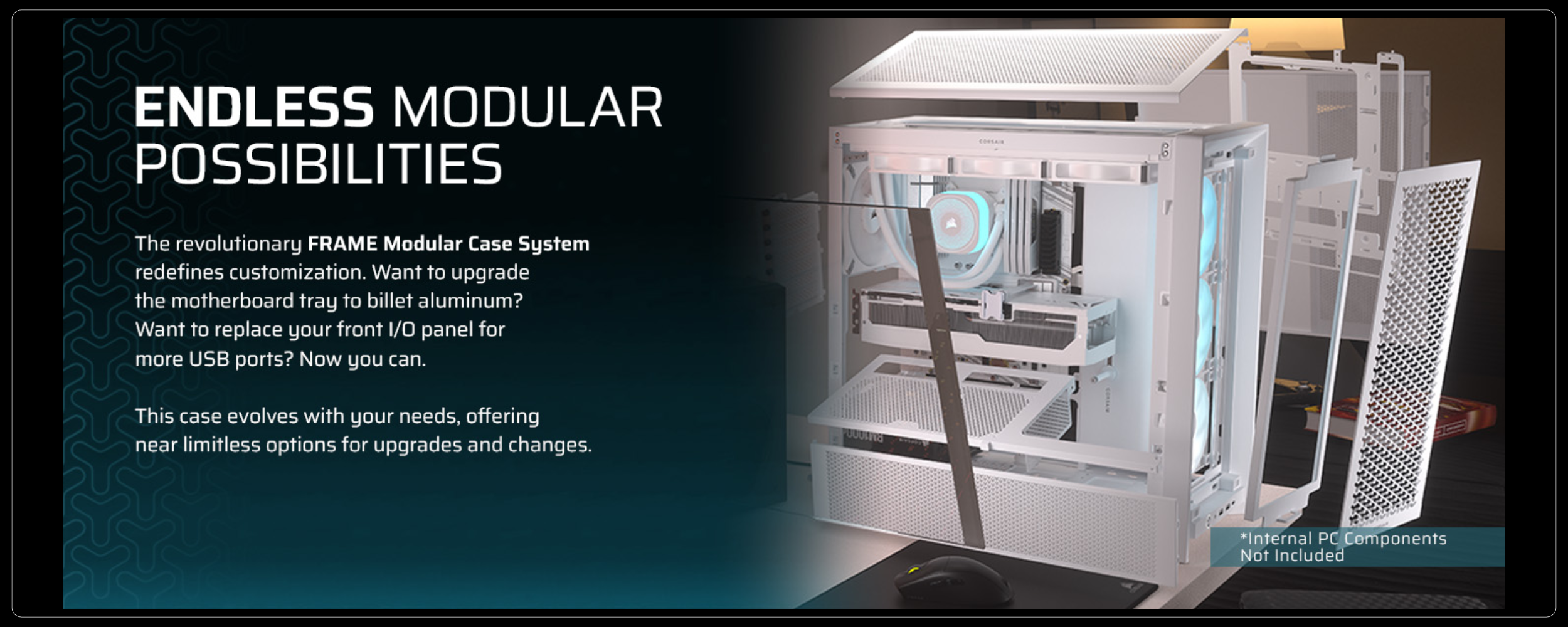 Evolve your FRAME 4000D RS ARGB mid-tower case to fit your changing needs. Options include changing the front grill with different designs, replacing the front I/O panel for more USB ports, and more.InfiniRail Fan Mounting System