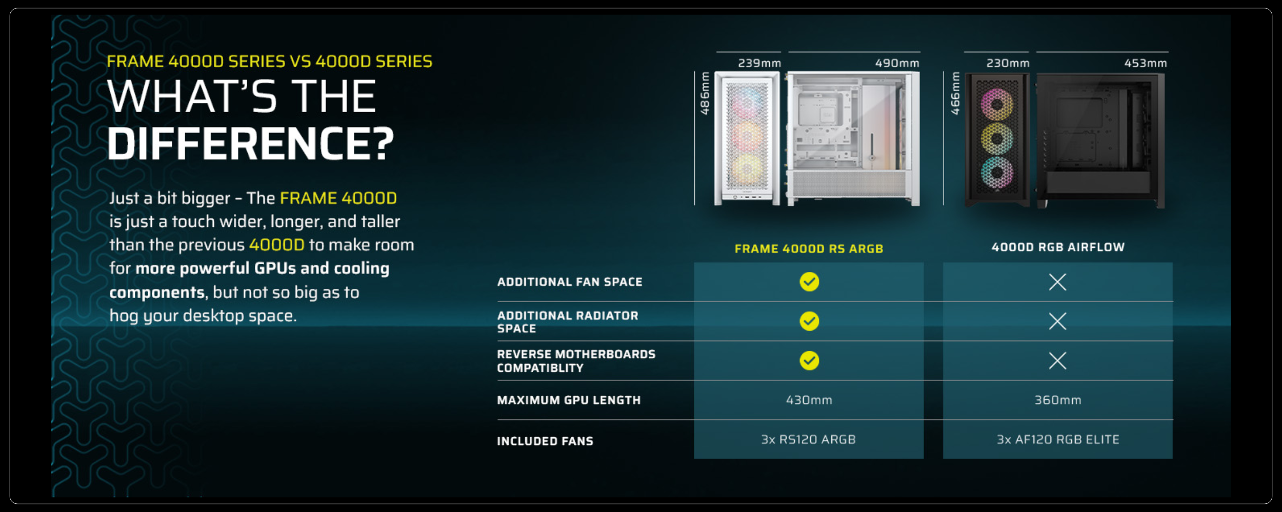 CORSAIR 4000D RS ARGB Modular Overview Optimize the performance and style of your computer build with the FRAME 4000D RS ARGB Mid-Tower E-ATX Desktop Case from Corsair. Designed with a spacious interior and fully modular design, this desktop computer case offers extensive versatility while supporting both traditional and reverse-connector E-ATX, ATX, micro-ATX, and mini-ITX motherboards. Inside, there is room for seven horizontal or three vertical expansion cards. There are also two 3.5" and four 2.5" drive bays. Three 120mm ARGB cooling fans are included. The front panel includes one USB-C 3.2 Gen 2 port that supports up to 10 Gb/s transfers with compatible devices alongside two 5 Gb/s USB-A 3.2 Gen 1 ports. The 3.5mm audio jack allows you to plug in a headset.