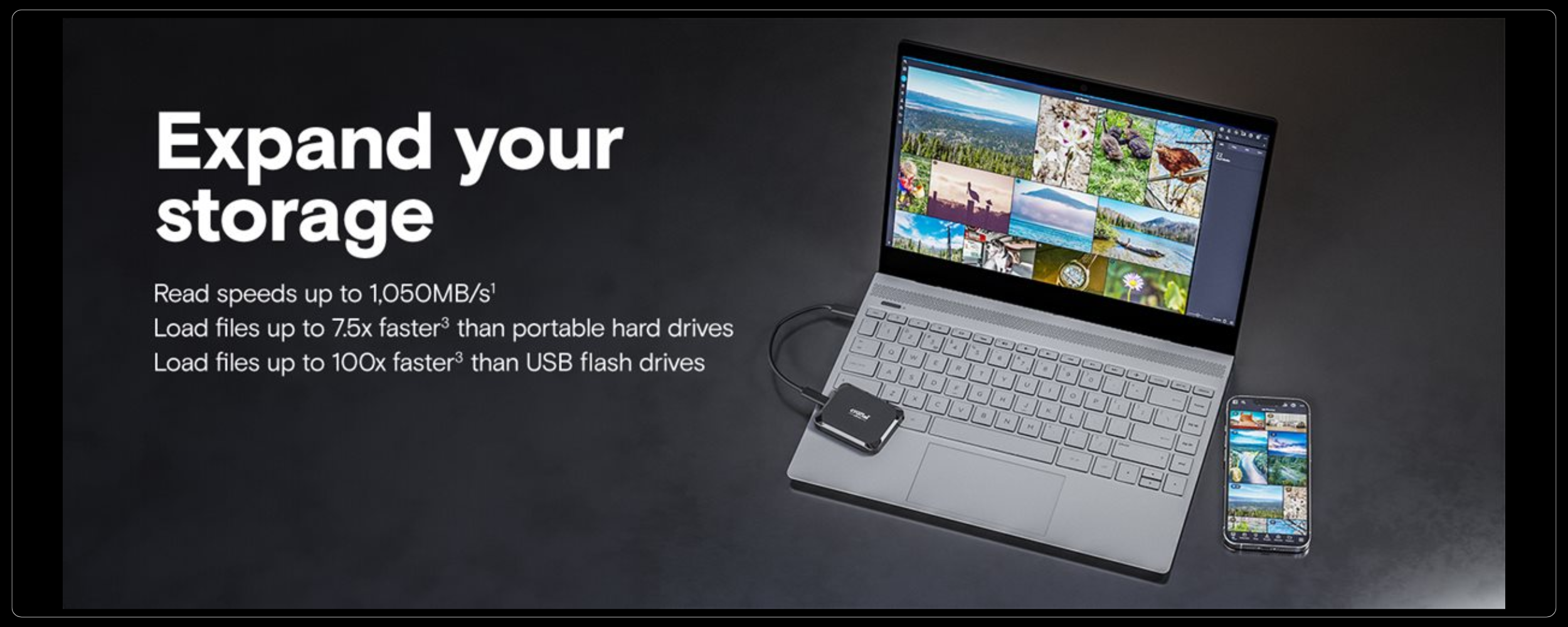 Crucial X9 Overview Store your most essential data with the lightweight and compact 1TB X9 USB-C 3.2 Gen 2 External SSD from Crucial. Providing you with up to 1TB capacity, you have enough room to store your media, games, raw files, and more. Operating on the USB-C 3.2 Gen 2 standard, you get enhanced read speeds up to 1050 MB/s, ideal for quickly moving information to and from your host device. The X9 has been drop tested from heights as high as 7.5-feet, giving you peace of mind in the event of accidental falls. With the included USB-C cable, you can easily connect this drive to your Windows, Mac, Android device, and iPad without the need to download any additional programs, ensuring proper plug and play usability. Additionally, you can use the X9 on gaming consoles such as the Xbox Series S|X and the PlayStation 5, allowing you to store older-gen games as well as your favorite clips and screen captures. You also get access to the free-to-download Acronis True Image software to assist with your files.