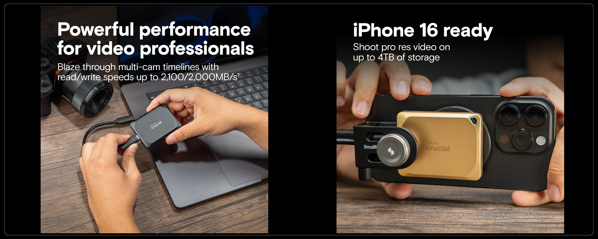 With read speeds of up to 2100 MB/s and write speeds of up to 2000 MB/s, the Crucial X10 Pro Portable SSD is powerful enough for editing directly from the drive.Adobe Creative Cloud