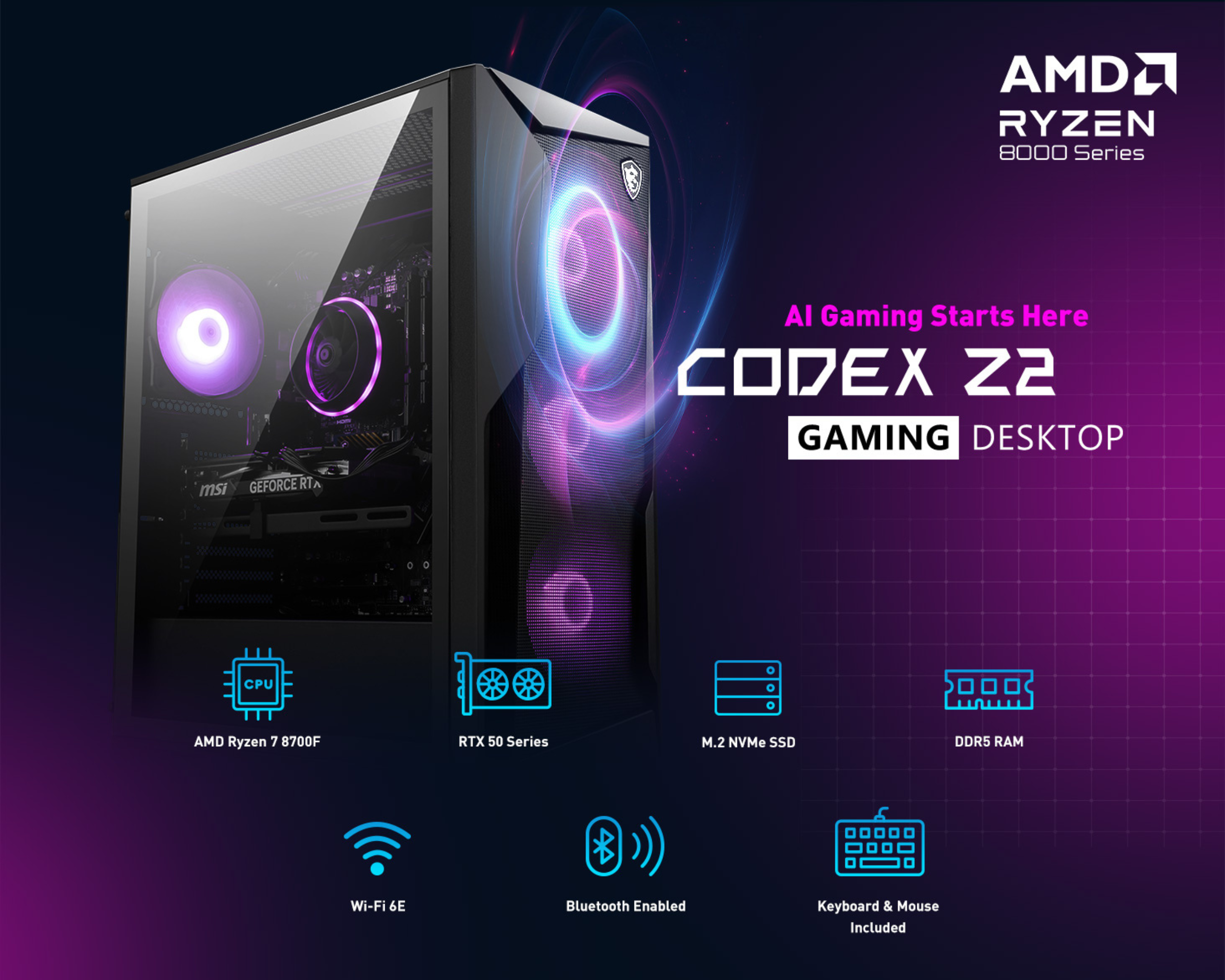 Boasting high-grade hardware, the Codex Z2 Gaming Desktop Computer from MSI provides gaming enthusiasts with enhanced performance to handle a wide range of graphically demanding titles. Outfitted with a fan cooled AMD Ryzen 7 8700F 8-Core processor and NVIDIA GeForce RTX 5060 Ti graphics, this desktop computer delivers rich gaming experiences while accelerating content creation. With 16GB of DDR5-6000 memory and a 2TB PCIe SSD, the Codex Z2 can quickly load and multitask demanding applications. Wi-Fi 6E (802.11ax) support and a GbE port provide low-latency connections to compatible networks for smooth online gaming and video streaming. The four USB-A 3.2 Gen ports support up to 5 Gb/s data transfers while the USB-C 3.2 Gen 2x2 port works with 20 Gb/s devices. You can reserve the four USB-A 2.0 ports for peripherals such as the included mouse and keyboard. Windows 11 Home is preinstalled.
