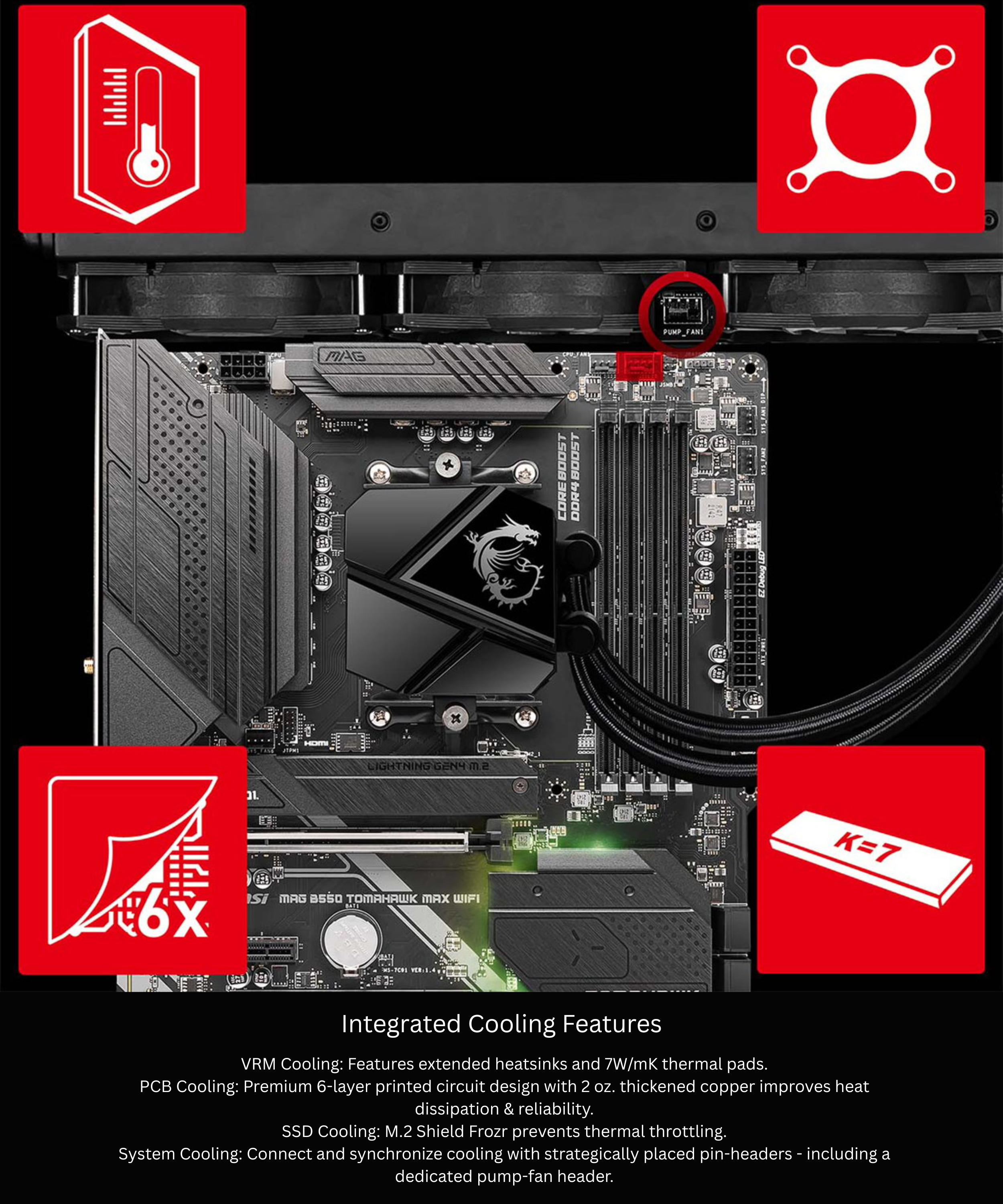 MSI provides multiple thermal solutions to keep your motherboard and components cool as you game. Pump fan support allows you to attach various water-cooling systems while also reducing radiator noise. Extended heatsinks and cooler pads provide better heat transference through the board, reducing temperature throughout the system. The M.2 Shield Frozr is a specialized heatsink designed for M.2 PCIe NVMe solid-state drives, preventing damage caused by overheating. A 7W/mk thermal pad provides better heat transfer, adding another layer of elemental protection.MSI Dragon Center