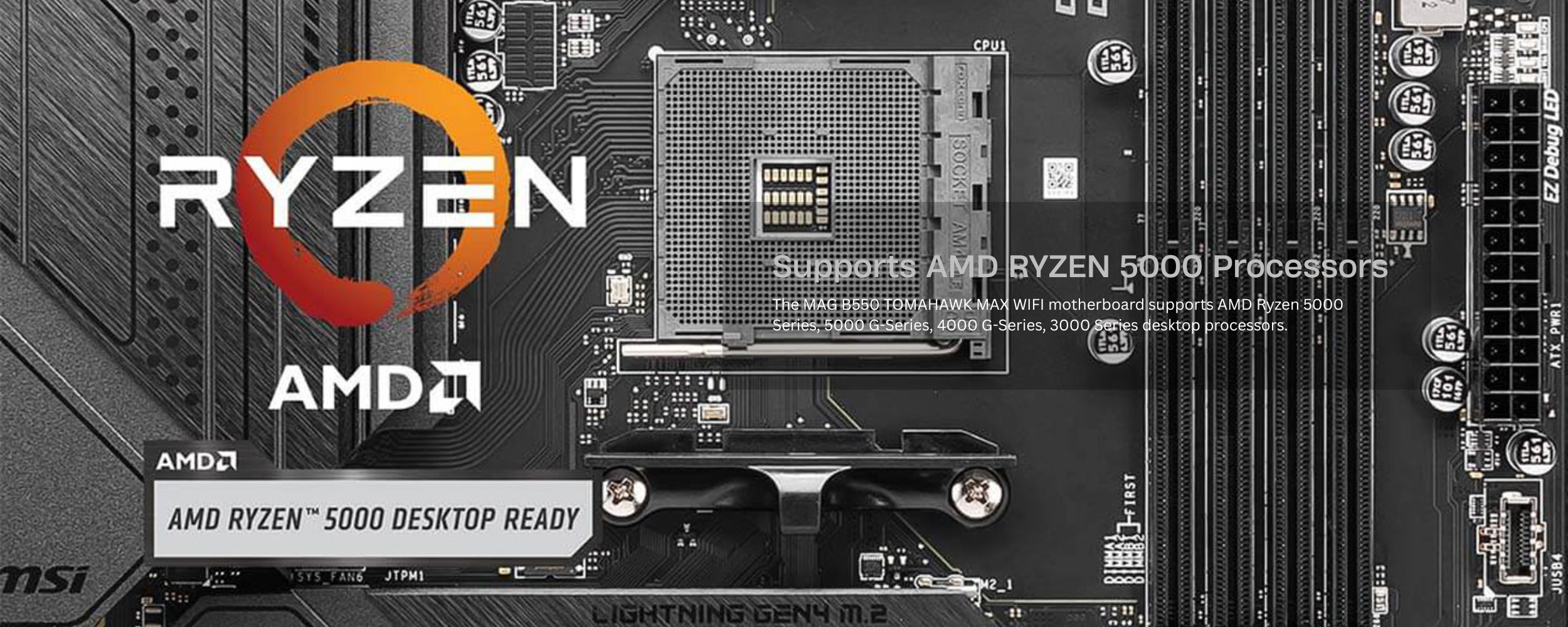 MSI B550 TOMAHAWK WiFi Overview From Manufacturer Conquer The Battlefield with the MAG B550 Motherboards | Gaming Motherboard | MSI A first look at MSI B550 motherboards | MSI Set the foundation of your next custom gaming-focused PC with the MAG B550 TOMAHAWK MAX WIFI AM4 ATX Motherboard from MSI. It's ideal for the gaming enthusiast who wishes to have complete control over their build without breaking the bank. Sporting the AMD AM4 socket and B550 chipset, you can easily use a wide range of Ryzen 5000, 4000, and 3000 Series processors. Four DDR4 RAM slots allow you to install up to 128GB of RAM with overclocking speeds up to 5100 MHz for greater multitasking, gaming, and render performance. Two M.2 SSD interfaces and six SATA ports allow you to amass multiple storage devices for your games, media, and more. Utilize graphics and utility cards with a series of expansion ports including one PCIe 4.0 x16, one PCIe 3.0 x16 (in x4 mode), and two PCIe 3.0 x1 slots. Between internal headers and back panel ports, you get access to multiple USB 2.0, 3.2 Gen 1, and 3.2 Gen 2 ports, allowing you to support a breadth of peripherals from keyboards to audio interfaces. Bluetooth 5.3 technology is also available giving you a true cable-free experience for your peripherals. Connect to your network wired or wirelessly with 2.5 Gigabit LAN or Wi-Fi 6E (802.11ax) technology.