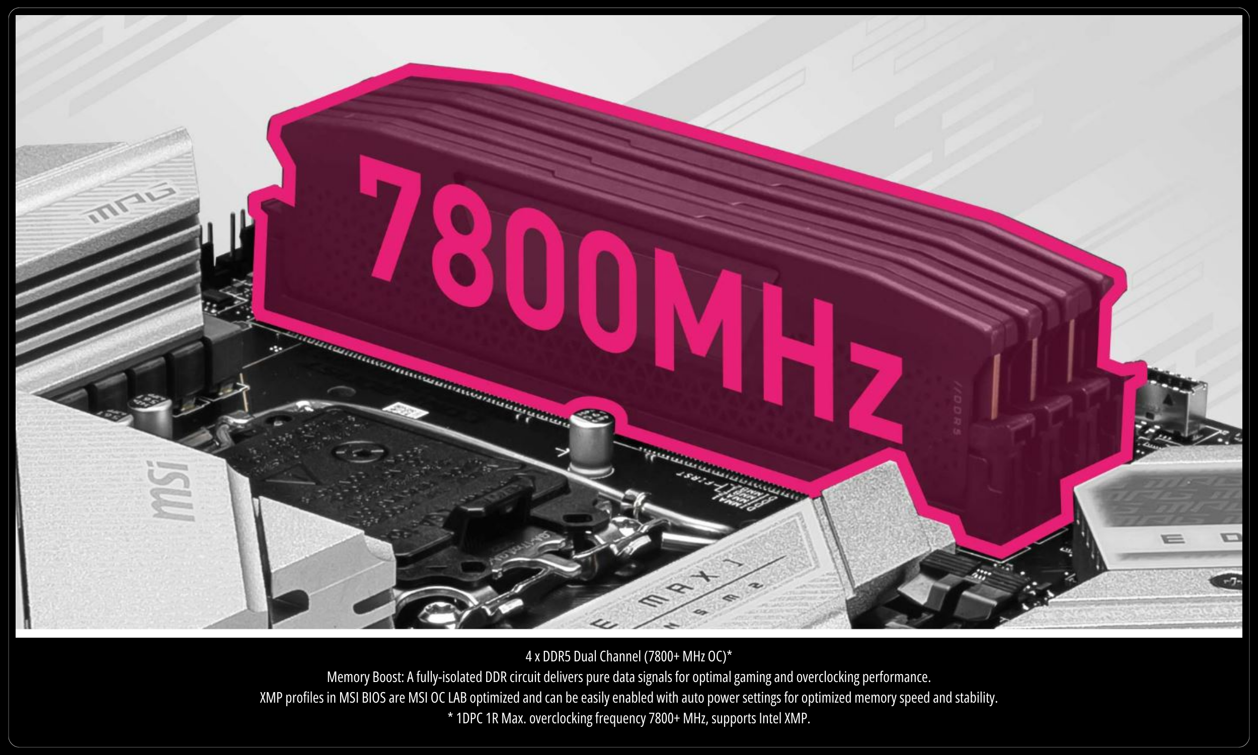 MSI's Lightning Gen 5 PCIe bandwidth supports up to 128 GB/s data transfer speeds and sports a Steel Armor covering that offers a reinforced casing to help support heavy, large graphics cards. You also get enhanced storage speeds, USB-C speeds, and more.Memory Layout