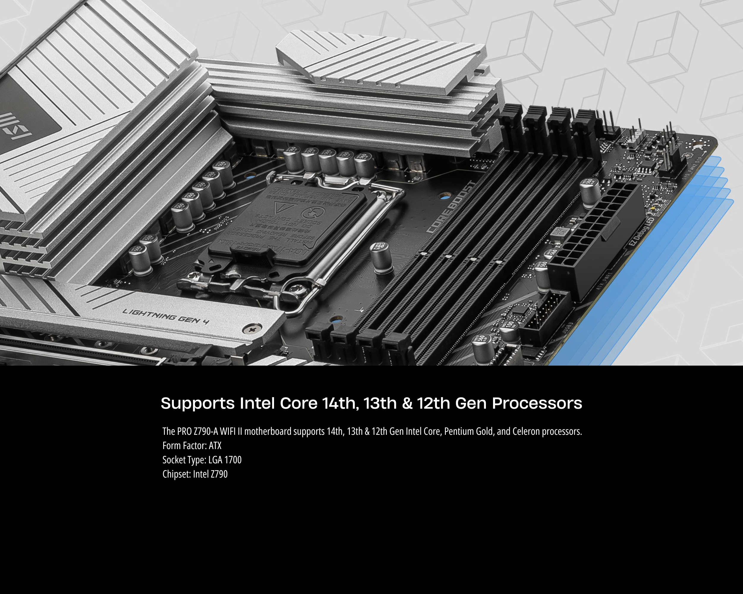 MSI Z790-A MAX WiFi Overview Replace or upgrade your business-level system with the MSI PRO Z790-A WIFI LGA 1700 ATX Motherboard. Providing ample connectivity options and the ability to leverage various powerful components, business users gain massive utility suitable for supporting a wide range of applications. Sporting an LGA 1700 socket, you can install a wide range of Intel Core 12th, 13th, and 14th gen processors, gaining the advantages of the Z790 socket. Four dual-channel DDR5 slots can support up to four 7800 MHz modules for a total of 192GB of memory, enhancing multitasking and render speeds. Create a large digital library for important business assets with six SATA and four M.2 SSD interfaces. Connect various graphics and utility cards with PCIe 5.0 x16, PCIe 4.0 x16 (in x4 mode), PCIe 3.0 x16 (in x1 mode), and PCIe 3.0 x1 slots. Between the back panel and internal headers, you get access to USB 2.0, 3.2 Gen 1, and Gen 2x2 Ports. You can also use Bluetooth 5.4 technology to connect wireless devices such as controllers, headsets, and more. Wi-Fi 7 (802.11be) and 2.5 GbE LAN give you wireless and wired network connectivity, allowing you to quickly download company assets, access cloud storage, watch media, and more.