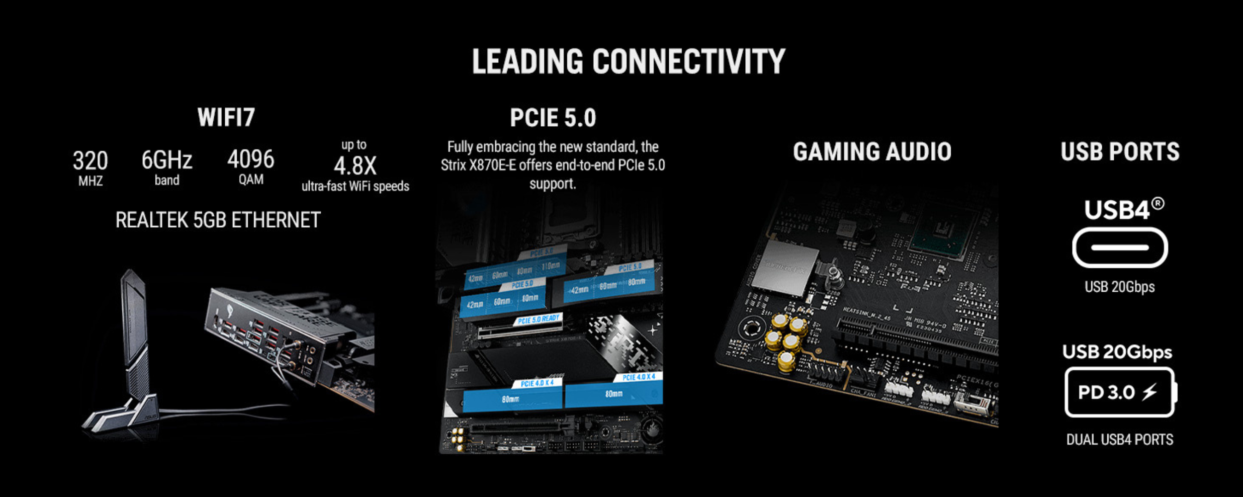 Power immersive gaming experiences and content creation with the ASUS ROG X870E-E GAMING WIFI AM5 ATX Motherboard as your foundation for your custom build. Supporting AMD 7000, 8000, and 9000 series processors and expansive connectivity, this socket AM5 motherboard is ready for overclocked components and demanding AI workloads. Four DDR5 DIMM slots are available, supporting up to 192GB of memory for smooth multitasking, large projects, and demanding applications. For storage, you can install up to three M.2 PCIe 5.0 SSDs alongside two PCIe 4.0 drives to store your games library and important files. There are also four SATA III connectors. A PCIe 5.0 x16 slot is available for powerful graphics cards while the PCIe 4.0 x16 slot supports compatible expansions. With two USB4 ports on the rear panel, you can connect 40 Gb/s compatible devices or a USB-C compatible 8K display. They are complemented by a 20 Gb/s USB-C port that also provides up to 30W power delivery. There are also nine USB-A and one USB-C port that can transfer up to 10 Gb/s with compatible devices. Built-in Wi-Fi 7 (802.11be) support and a 5 Gb/s Ethernet port provide you with fast connections to compatible network devices. Windows 11 64-bit is required to take advantage of all the motherboard's features. ASUS AI Intelligence