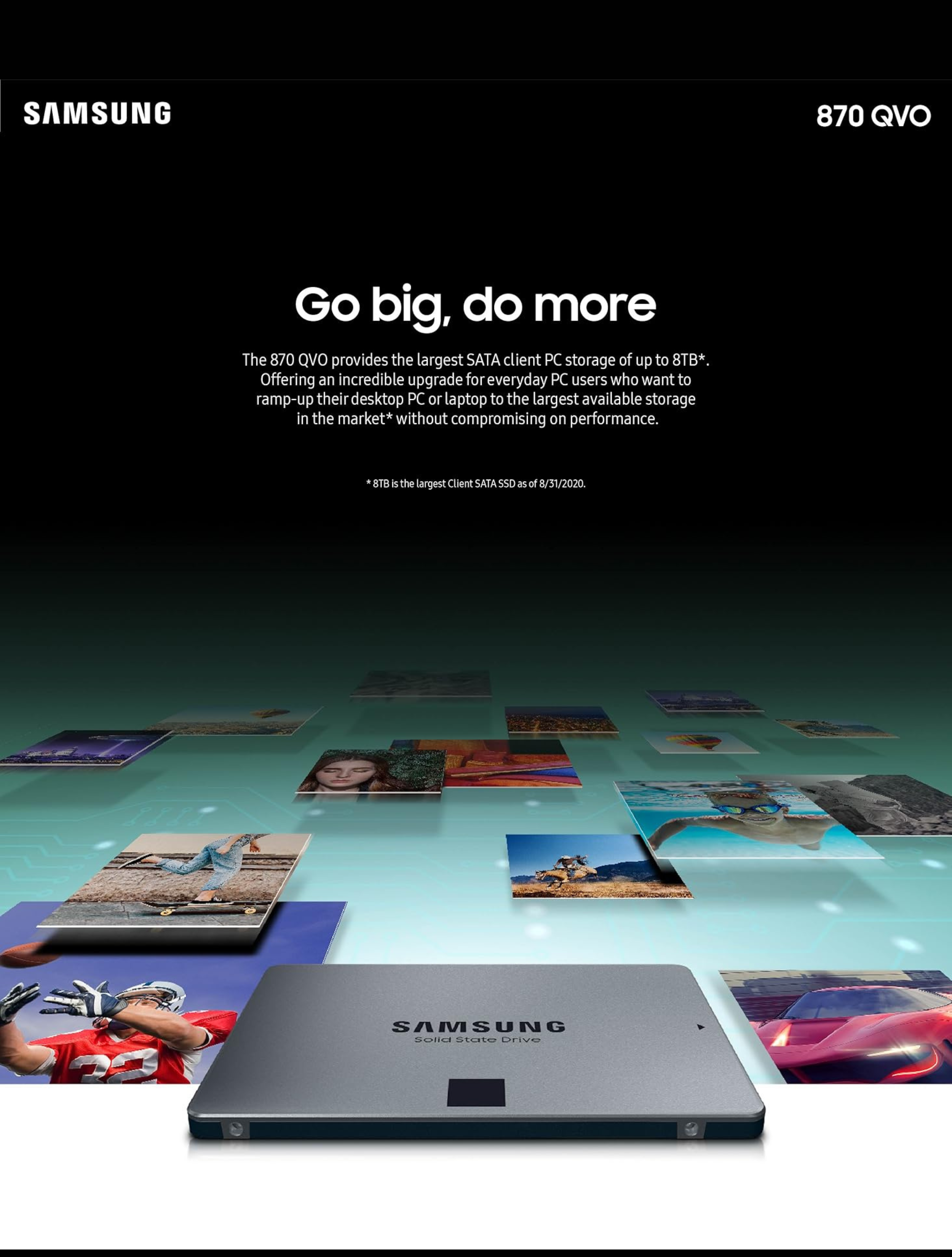 GO BIG, DO MORE: The 870 QVO is Samsung's latest 2nd generation QLC SSD with up to 8TB of storage capacity ENHANCED IN EVERY WAY: With an expanded, SATA interface limit of 560/530 MB/s sequential speeds, the 870 QVO improves random access speed and sustained performance BOOST CAPACITY: The 870 QVO is available in 1, 2, 4 and 8TB RELIABLE AND SUSTAINABLE: The capacity of the 8TB 870 QVO increases reliability up to 2,880 TBW using a refined ECC algorithm for stable performance UPGRADE WITH EASE: Upgrading to 870 QVO is now easier than ever for anyone with a desktop PC or laptop that supports a standard 2.5 inch SATA form factor SAMSUNG MAGICIAN SOFTWARE: Manage your drive and enhance its performance with tools that keep up with the latest updates and monitor the drive's health and status WORLD'S No.1 FLASH MEMORY BRAND: All firmware and components, including Samsung's world renowned DRAM and NAND, are produced in house, allowing end to end integration for quality you can trust