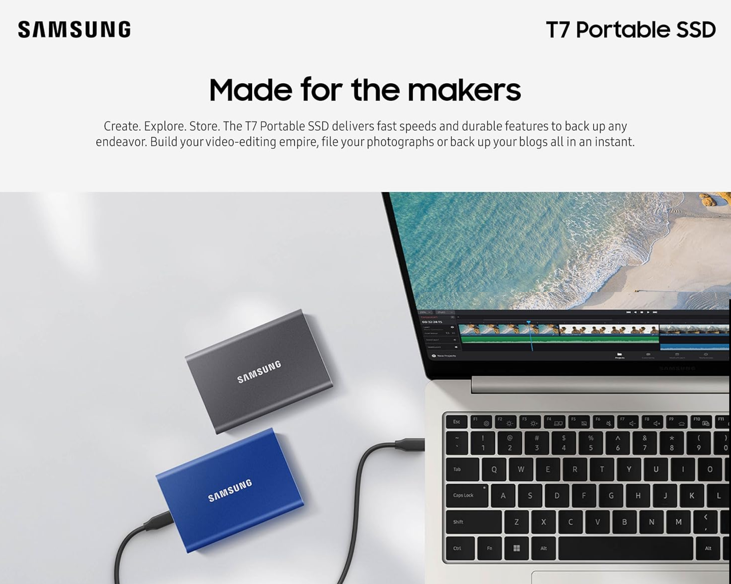 Boasting a slim and lightweight body, the T7 is designed for easy transport via a pocket-sized form factor. Roughly the size of a credit card and weighing in at just 2 ounces, this drive features a solid aluminum unibody construction that fits comfortably in the palm of your hand. SSD stands for Solid State Drive, which means it's built with no moving parts. The hardware can be secured with an AES 256-bit encrypted password and is encased in a sturdy metal body that keeps data intact from falls of up to 6.6'. Use the T7 without worrying about overheating. An advanced thermal solution uses Dynamic Thermal Guard technology to withstand and control heat, so the compact SSD stays at an optimal temperature even at fast speeds.Optimize Performance with Embedded Management Software