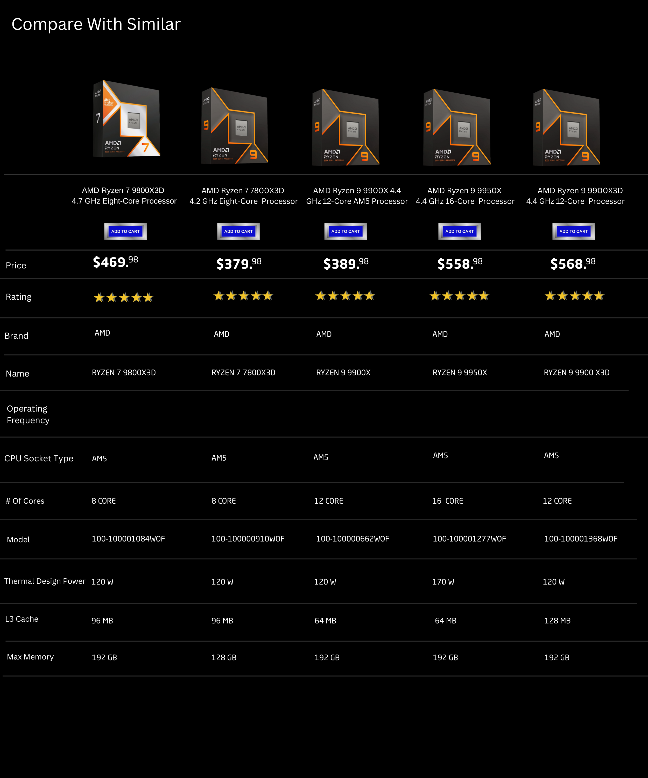 For gamers looking to upgrade their socket AM5 motherboards, the Ryzen 7 9800X3D 4.7 GHz Eight-Core AM5 Processor is ready to let you boost frame rates and graphics settings in the latest triple-A titles. Like other X3D CPUs, the 9800X3D features AMD 3D V-Cache technology designed to boost gaming performance by positioning its 96MB of ultra-fast stacked L3 cache close to the cores. Built upon Zen 5 architecture and providing eight-core, sixteen-thread processing, the 9800X3D can achieve a 4.7 GHz base clock speed, with a max boosted clock of 5.2 GHz. Other advanced technologies that are supported include PCIe 5.0 for high-end graphics cards and SSDs, and up to 192GB of speedy DDR5-5600 memory.